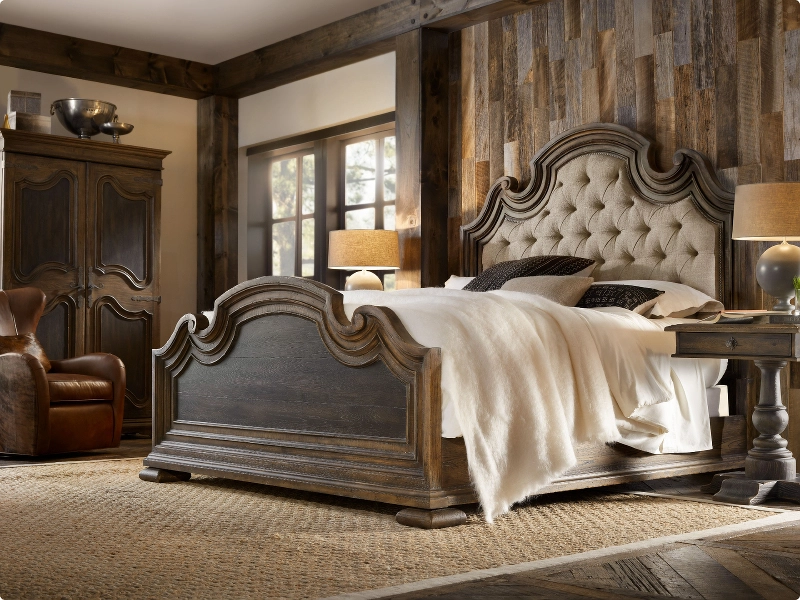 Crafted with meticulous attention to detail, this bed features an exquisite button-tufted upholstered design, set against an elaborately carved and shaped headboard and footboard. The fusion of an aged black finish at the heart of the footboard and a timeworn saddle brown on the headboard and footboard’s carved border exudes a vintage charm.